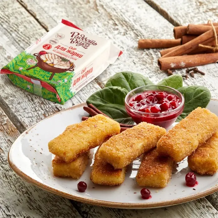Сыр для жарки и гриля «Радость вкуса» — это уникальный сыр, который жарится без масла на сковороде или гриле буквально за пару минут. Готовый продукт покрывается аппетитной золотистой корочкой, оставаясь внутри при этом нежным и воздушным. Благодаря неповторимой текстуре и нежно-молочному, слегка солоноватому вкусу, сыр достаточно быстро завоевывает свою популярность.