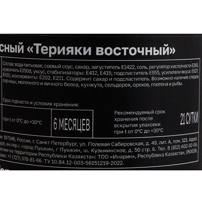 Вода питьевая, соевый соус, сахар-песок, загуститель, соль поваренная пищевая, уксус яблочный, масло растительное, регулятор кислотности, стабилизатор, консервант, краситель.