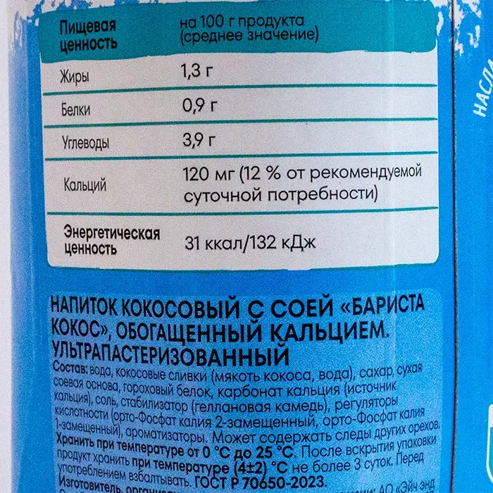 Вода, кокосовые сливки (мякоть кокоса, вода), сахар, сухая соевая основа, гороховый белок, карбонат кальция (источник кальция), соль, стабилизатор (геллановая камедь), регуляторы кислотности (орто-Фосфат калия 2-замещенный, орто-Фосфат калия 1-замещенный), ароматизаторы.