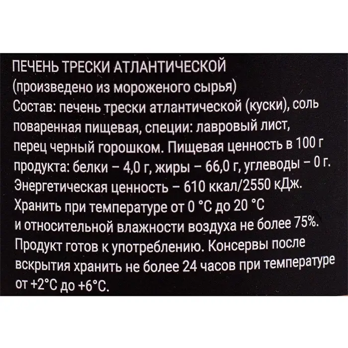 печень трески атлантической (куски), соль поваренная пищевая, специи: лавровый лист, перец черный горошком.