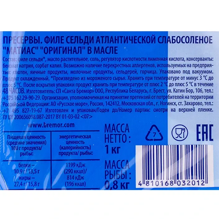 Сельдь филе слабосоленое в масле «Матиас», 1 кг