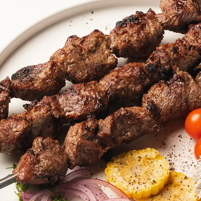 Сочные, нежные кусочки мраморной говядины не содержат костей, имеют мягкую упругую текстуру, выраженную мраморность, насыщенный говяжий вкус с пикантными грибными нотами и пряный землистый аромат. Маринад размягчает мясо, придавая ему тающую текстуру.