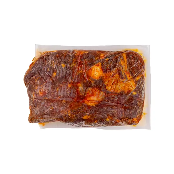 Сочные, нежные кусочки мраморной говядины не содержат костей, имеют мягкую упругую текстуру, выраженную мраморность, насыщенный говяжий вкус со сладковатыми нотами и аромат. Маринад размягчает мясо, придавая ему тающую текстуру, пряные ноты и фруктовый аромат. После обжарки на углях мясо получается сочным и мягким с хрустящей корочкой.