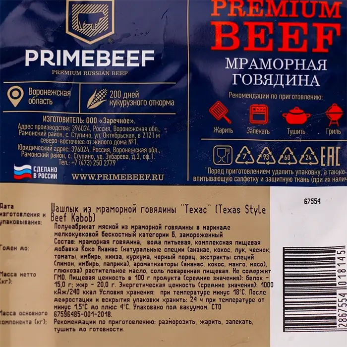 Шашлык из мраморной говядины Техас «Праймбиф», 2,1 кг