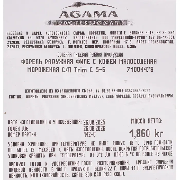 Филе форели слабой соли 353 XXL «Агама», трим С, 1,7–2,2 кг