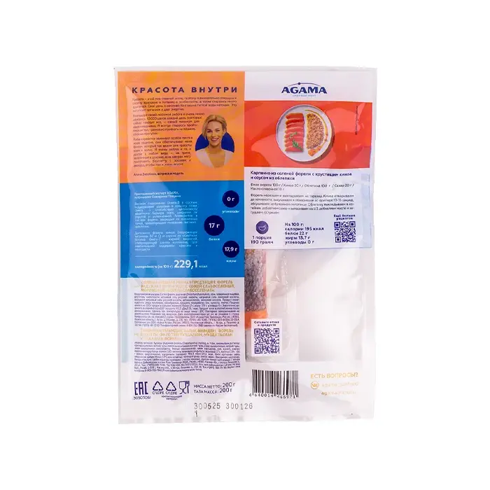 Форель без костей имеет нежный слабосоленый вкус и плотную текстуру. Филе готово к употреблению и не требует термической обработки. Вакуумная упаковка защищает продукт от влаги, внешних воздействий и воздуха, что позволяет продлить срок его хранения.