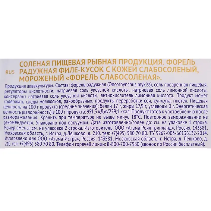 Форель радужная (Oncorhynchus mykiss), соль поваренная пищевая, регуляторы кислотности: натриевая соль уксусной кислоты, натриевая соль лимонной кислоты, консервант натриевая соль уксусной кислоты, антиокислитель лимонная кислота.
