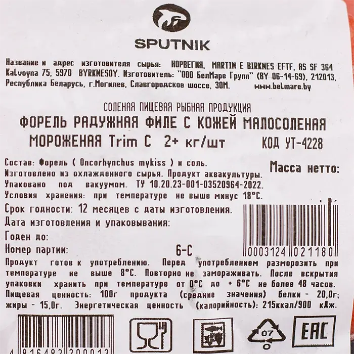 Филе форели слабой соли «БелМаре Групп», трим С, 2,2-2,6 кг