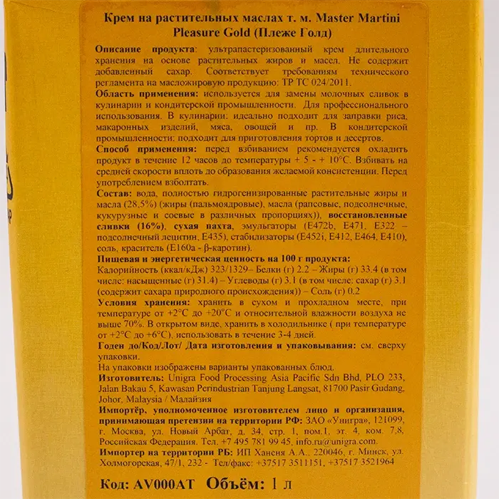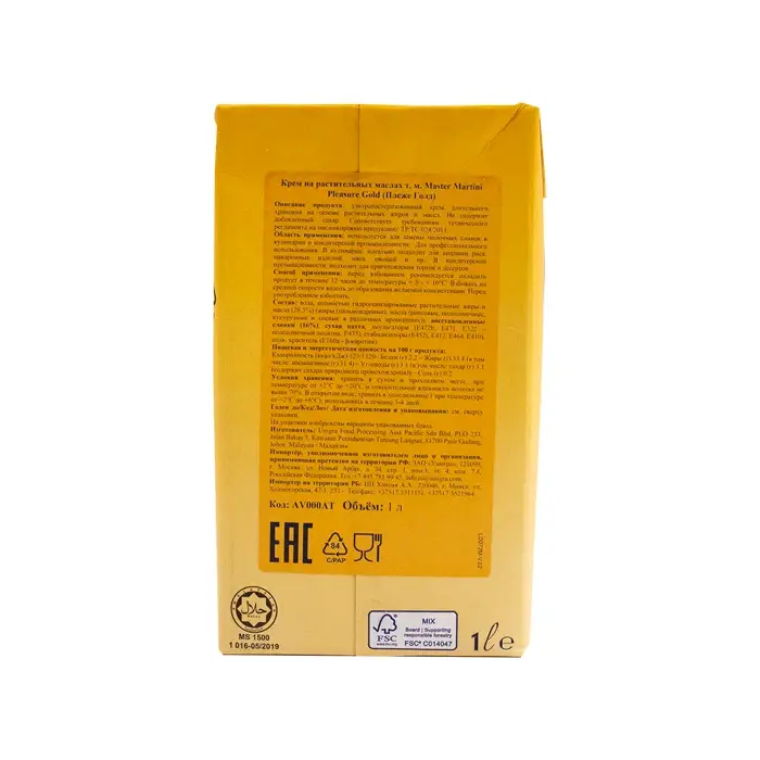 Крем на растительных маслах без сахара жир. 33,5% Pleasure Gold "Master Martini", 1 кг