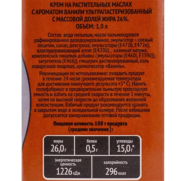 Продукт может использоваться в кулинарии, например, для приготовления десертов, выпечки или кондитерских изделий. Растительные масла обеспечивают гладкую текстуру, а аромат ванили добавляет приятный вкус. Низкое содержание жира (26%) позволяет использовать этот крем в рецептах, где важно контролировать калорийность блюда.