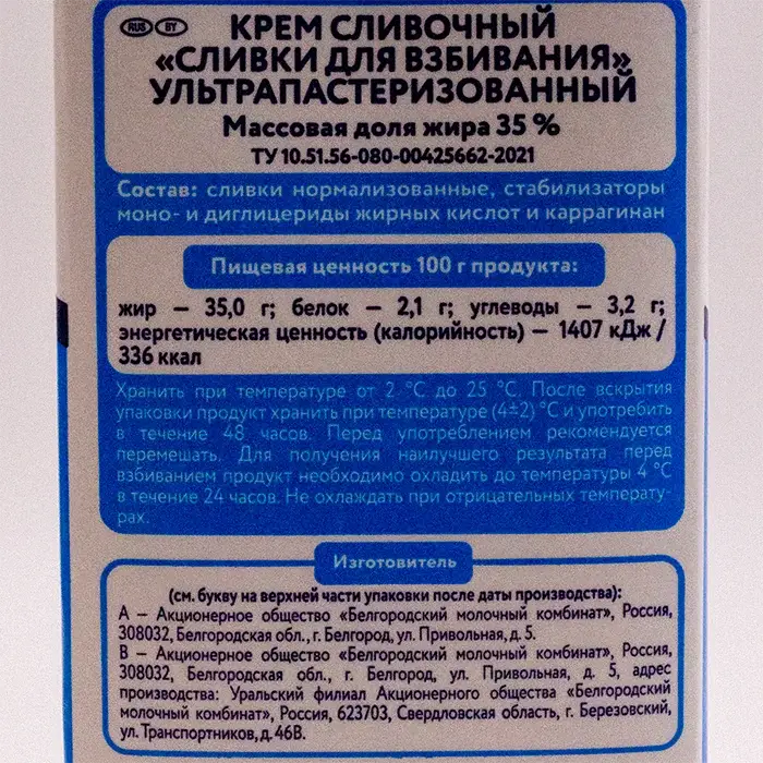 Сливки для взбивания жирностью 35% приготовлены из молока без использования консервантов, имеют воздушную, кремовую текстуру, нежный, сливочный вкус. Сливки хорошо взбиваются до устойчивых пиков, не отсекаются, не расслаиваются хлопьями.