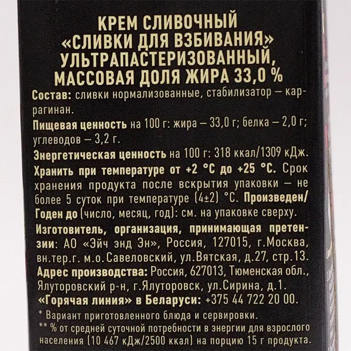 Предназначенный специально для приготовления пышных и стабильных кремов. Подходит для украшения тортов, пирожных, эклеров и других кондитерских изделий. Благодаря высокому содержанию жира (33%) сливки легко взбиваются в густую массу с гладкой структурой и устойчивым объемом, сохраняя форму даже при комнатной температуре.