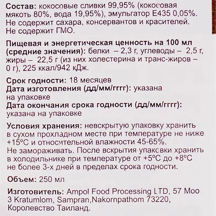 Кокосовые сливки 99,95% (кокосовая мякоть - 80%, вода 19,95%, эмульгатор Е435 0,05%). Не содержит сахара, консервантов и красителей. Не содержит ГМО.