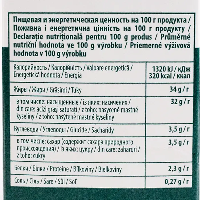 вода, полностью гидрогенизированные растительные масла и жиры (28,5%) (жиры (пальмоядровые), масла (подсолнечные)), сливки (10%), обезжиренное сухое молоко, сухая пахта, эмульгаторы (E472b, E471, E322 - подсолнечный лецитин, E435), стабилизаторы (E464, E412, E410), соль, краситель (E160a - бета-каротин).