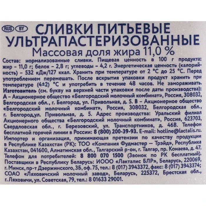 Питьевые сливки жирностью 11% приготовлены на основе свежего молока, не содержат консервантов, имеют нежный кремовый вкус, легко взбиваются в пену.