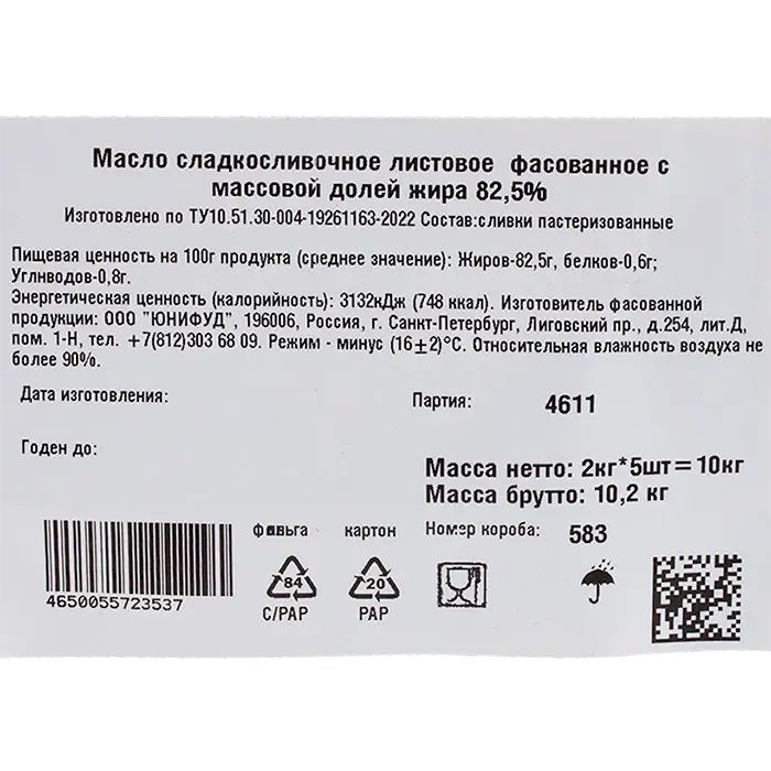 Сладкосливочное листовое масло жирностью 82,5% производится из пастеризованных сливок без ароматизаторов, консервантов и растительных жиров. Продкут имеет насыщенный сливочный вкус, однородную, пластичную текстуру, термостабильно.