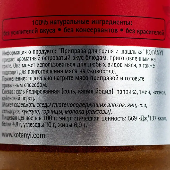 Йодированная поваренная соль (поваренная соль, йодид калия), паприка, тмин, чеснок, кайенский перец.