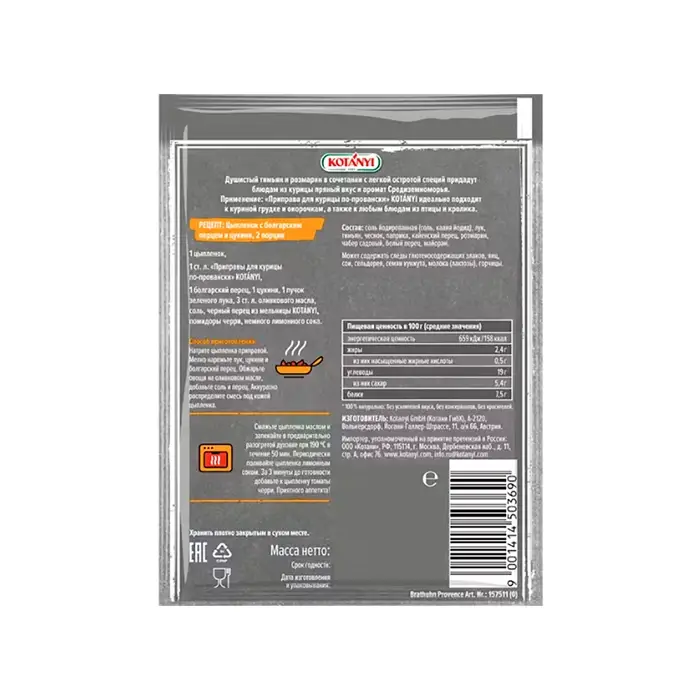 Сочетание белого перца, душистого тимьяна и розмарина, мягкой паприки, острого кайенского перца, сладко-горького майорана, перечного чабера придает блюдам пряный вкус и сбалансированный аромат средиземноморья.