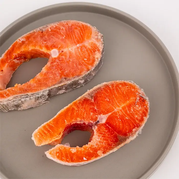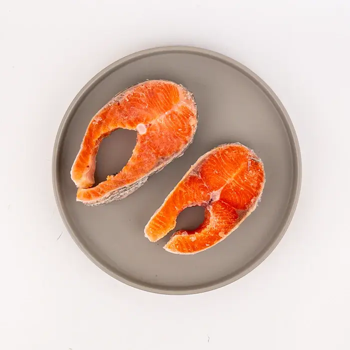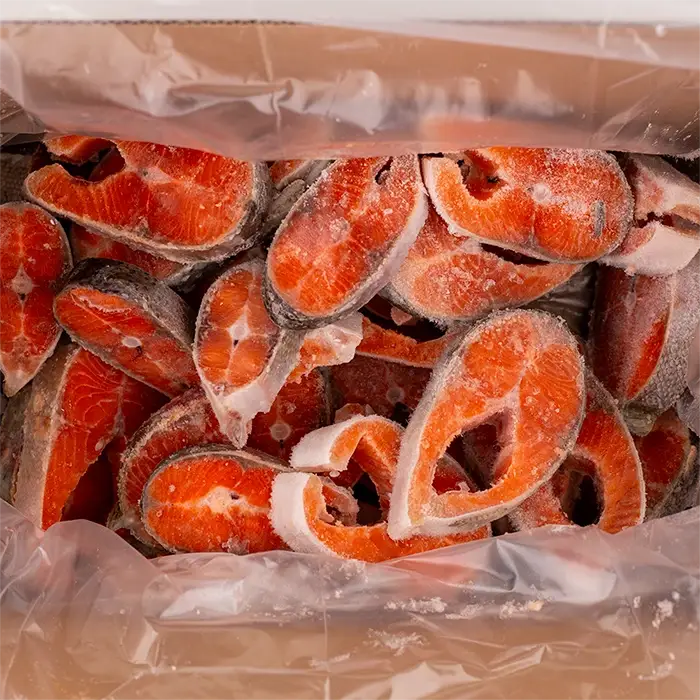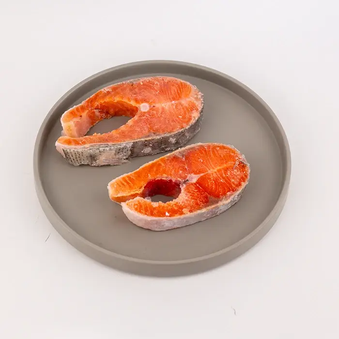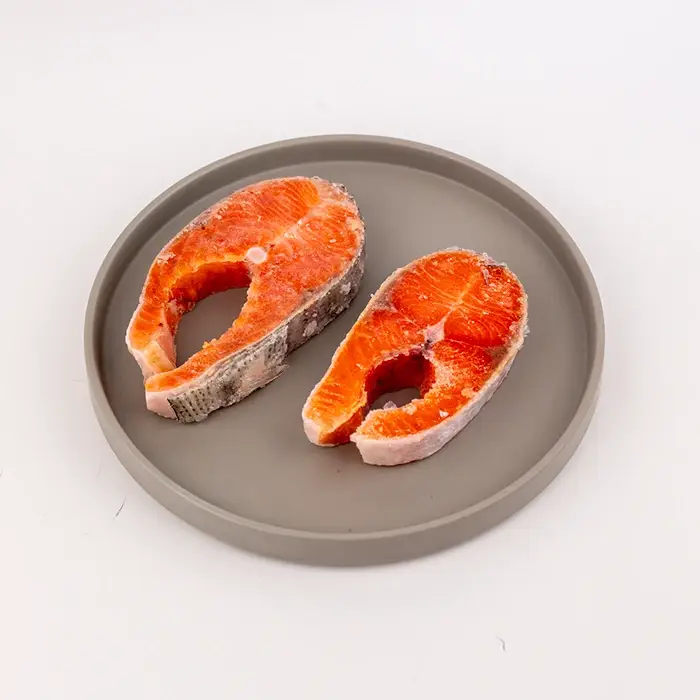 Стейки поперечной нарезки из отборной радужной форели, рыба имеет бледно-оранжевый цвет, нежную, сочную и в меру плотную текстуру. Форель более постная по сравнению с семгой.