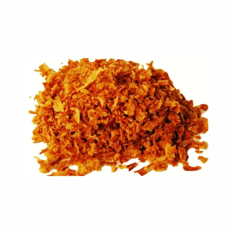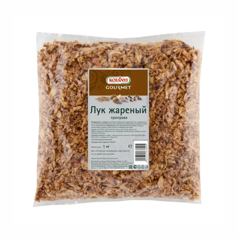 Золотисто-коричневый лук со слегка сладким вкусом поджарен на чистом растительном масле до хрустящей корочки.