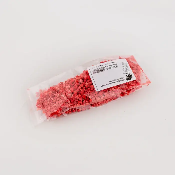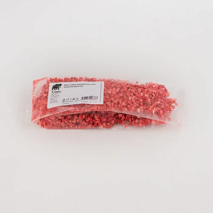 Сублимированная клубника имеет воздушно-хрустящую текстуру, яркий кисло-сладкий вкус и свежий аромат спелой ягоды.