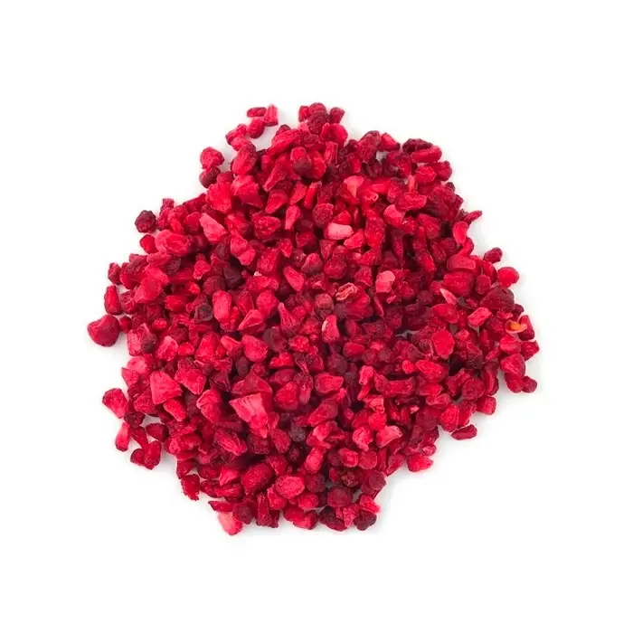 Сублимированная малина имеет легкую, воздушно-хрустящую текстуру, сладкий вкус с выраженной кислинкой и свежий аромат спелой ягоды.