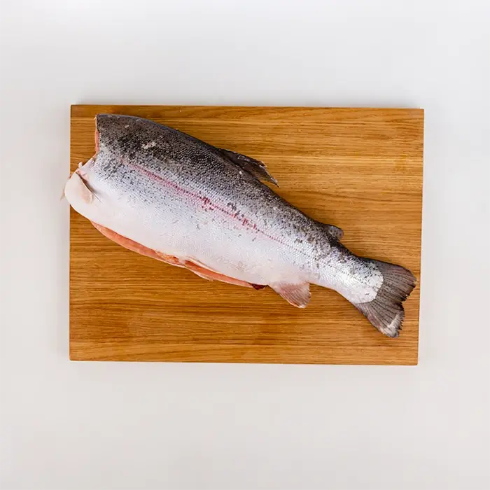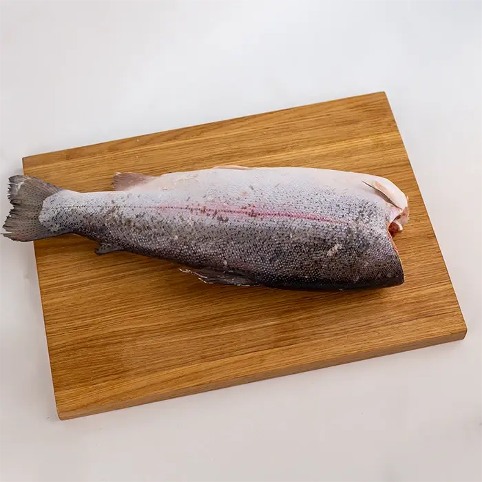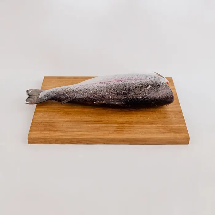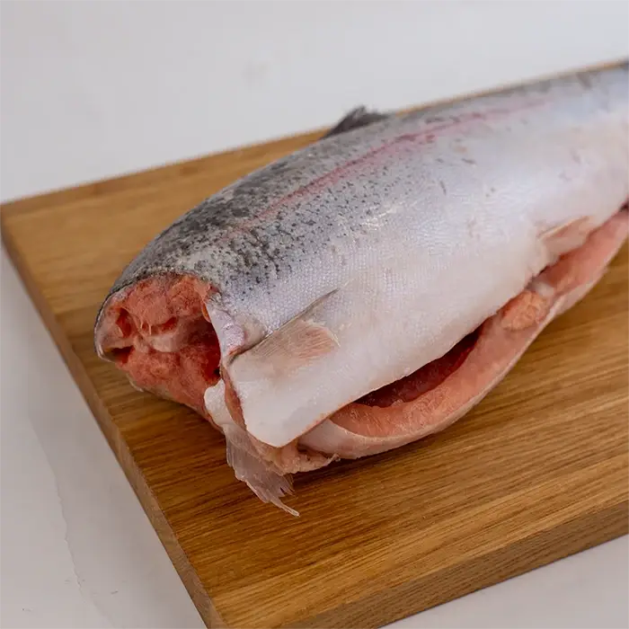 Форель, потрошеная без головы, среднего размера с нежным светло-розовым цветом мяса. Рыба обладает нежной, тающей и слоистой текстурой, сладковатым вкусом и чистым свежим ароматом. По сравнению с семгой является более постной рыбой.