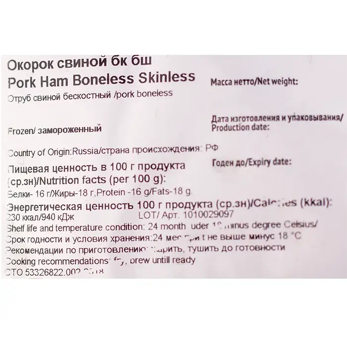 Окорок отличается сочной и плотной мякотью, окруженной тонким слоем пленки и жира, насыщенным красным цветом, мраморным рисунком, выраженной структурой мясных волокон, нежной текстурой и ярким мясным вкусом.