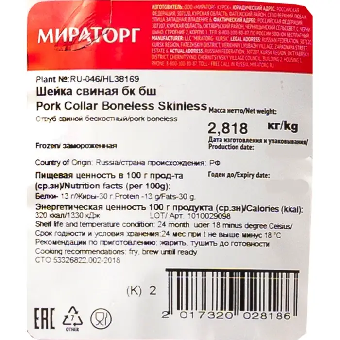 Шейка свиная без кости «Мираторг», 1,6–3,7 кг