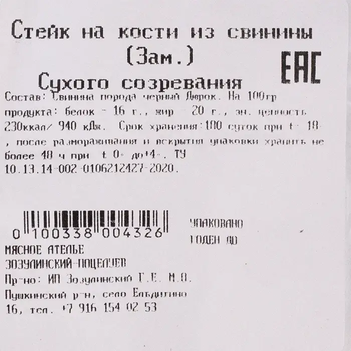 Свинина, стейк сухого вызревания на кости Duroc, 400 гр