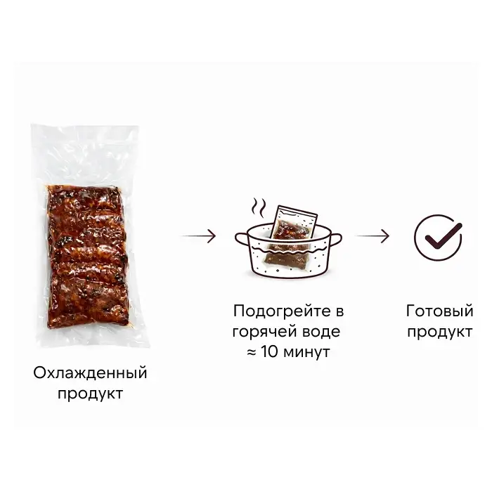 Погрузите продукт в вакуумной упаковке (сняв этикетку) в горячую воду (около +80 °C) в течение 10—15 минут. Затем после вскрытия продукт готов к употреблению.