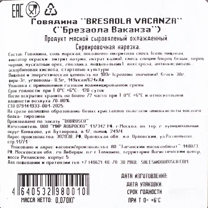 Брезаола говядина Bresaola Vacanza Dobrosco, нарезка, 70 г