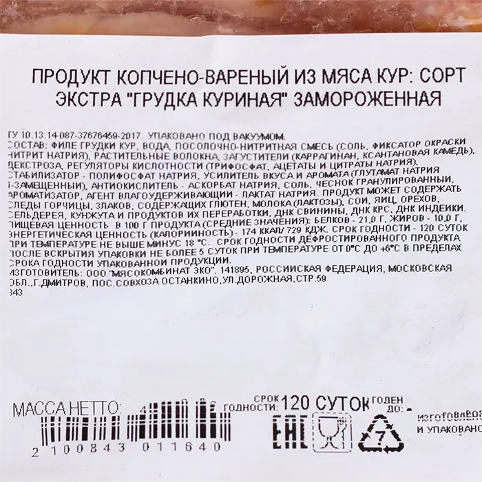 Филе грудки кур, вода, подсолочно-нитритная смесь (соль, фиксатор окраски нитрит натрия), растительные волокна, загустители (каррагинан, ксантановая камедь), декстроза, регуляторы кислотности (трифосфат, ацетаты и цитраты натрия), стабилизатор — полифосфат натрия, усилитель вкуса и аромата глутамат натрия, антиокислитель — аскорбат натрия, соль, чеснок гранулированный, ароматизатор, агент влагоудерживающий — лактат натрия. На предприятии перерабатываются: горчица, молоко, яичный порошок, соя, орехи, и продукты их переработки.