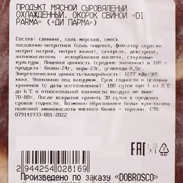 Окорок Di Parma — сыровяленый деликатес из свинины, изготавливаемый в соответствие с итальянскими традициями. Парма имеет нежный розовый цвет, гладкую поверхность, плотную, упругую текстуру, мягкий сладковато-соленый вкус с легкими ореховыми нотами и насыщенный и характерный аромат с мясными и пикантными оттенками.