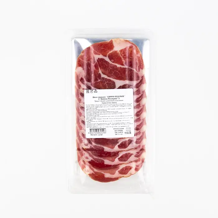 Шея Coppa Riserva — сыровяленый деликатес из свинины, изготавливаемый в соответствие с итальянскими традициями. Коппа содержит тонкие жировые прослойки, которые придают продукту сочность и мягкость. Шея имеет плотную, упругую текстуру, пряный, слегка сладковатый вкус с тонкими оттенками перца и ароматных трав.
