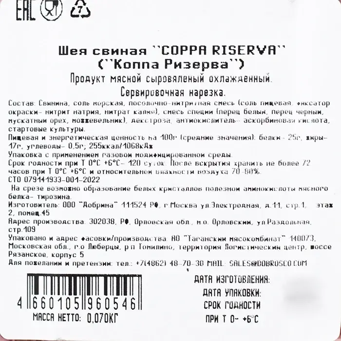 Шея свиная Coppa Riserva Dobrosco, нарезка, 70 г