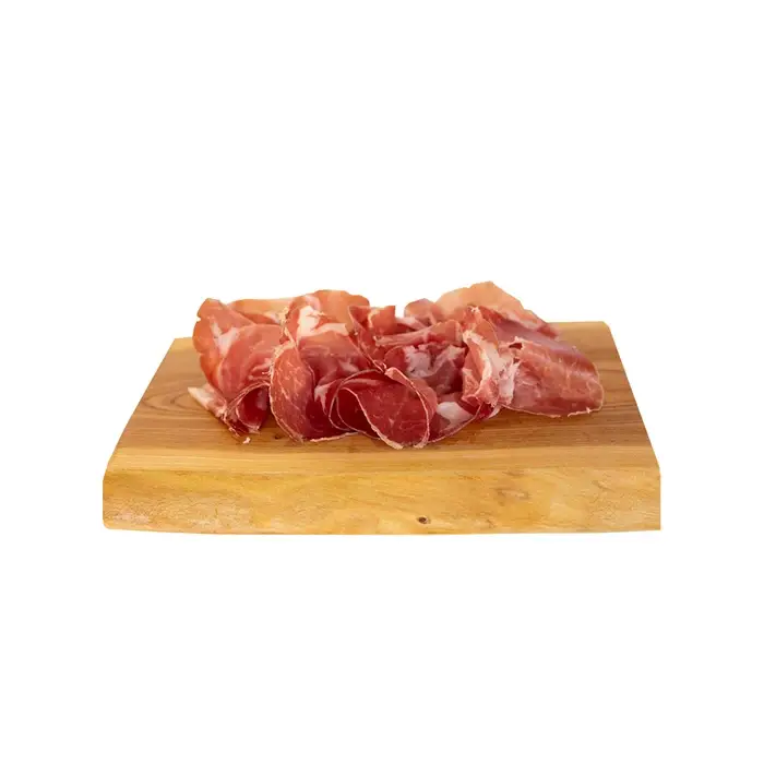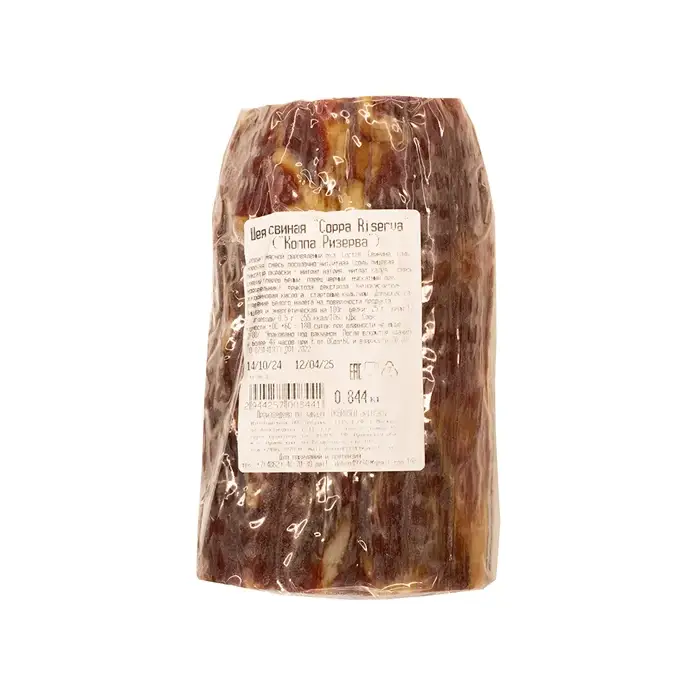 Шея Coppa Riserva — сыровяленый деликатес из свинины, изготавливаемый в соответствие с итальянскими традициями. Коппа содержит тонкие жировые прослойки, которые придают продукту сочность и мягкость. Шея имеет плотную, упругую текстуру, пряный, слегка сладковатый вкус с тонкими оттенками перца и ароматных трав.