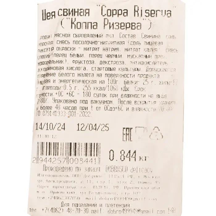 Шея сыровяленая Coppa Riserva Dobrosco, 1 кг