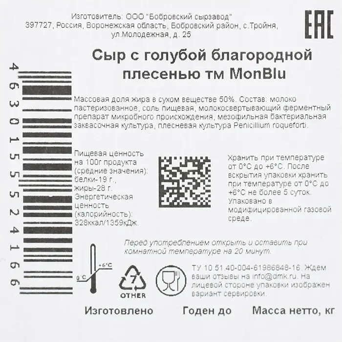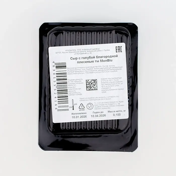 Молоко пастеризованное, соль, уплотнитель: хлорид кальция, молокосвертывающий ферментный препарат микробного происхождения, мезофильная бактериальная заквасочная культура, плесневая культура Penicillium Roqueforti.