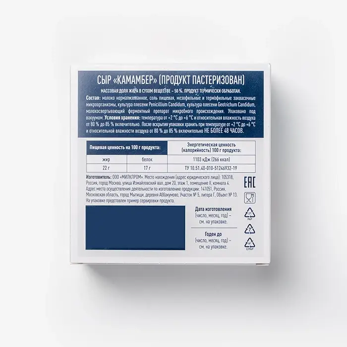 Молоко нормализованное, соль пищевая, мезофильные и термофильные заквасочные микроорганизмы, культура Penicillum Candidum, культура Geotrichum Candidum, молокосвертывающий ферментный препарат микробного происхождения.