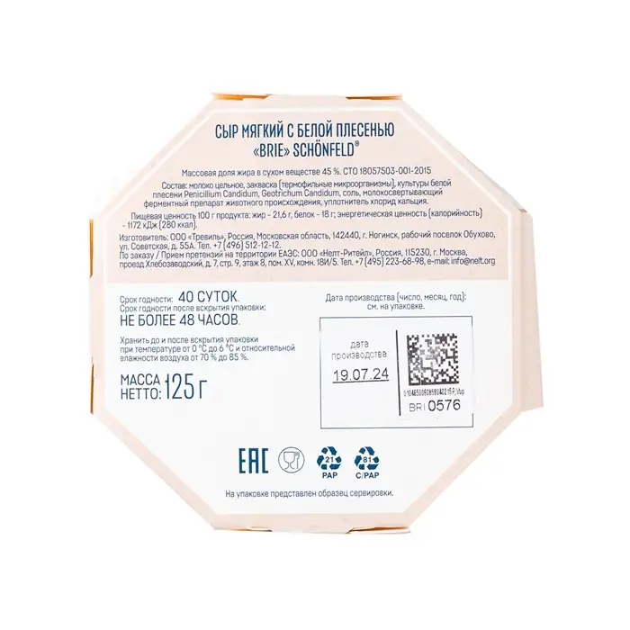 Сыр мягкий с белой плесенью Бри 45% Schonfeld, 125 г