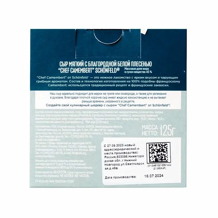 Сыр мягкий с белой плесенью Chef Камамбер 45% Schonfeld, 125 г