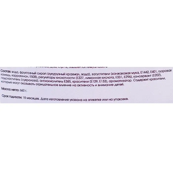 крахмал, вода), загустители (конжаковая мука, Е1442, Е401, гуаровая камедь, каррагинан, Е508), регуляторы кислотности (Е327, лимонная кислота, Е331, Е296), консервант (Е202), подсластитель (сукралоза), антиокислитель Е385, красители (Е129, Е133), ароматизатор