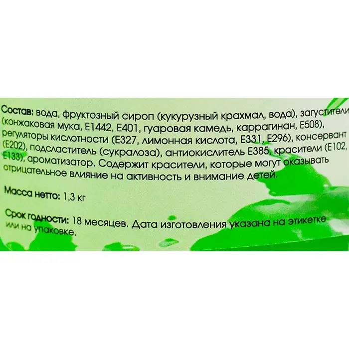 Питьевая вода, фруктозный сироп, белый сахар, пищевой краситель, пищевые добавки, пищевой ароматизатор.