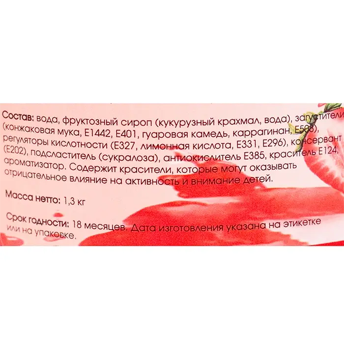 Питьевая вода, фруктозный сироп, сахар, пищевые добавки, краситель, ароматизатор «Клубника».