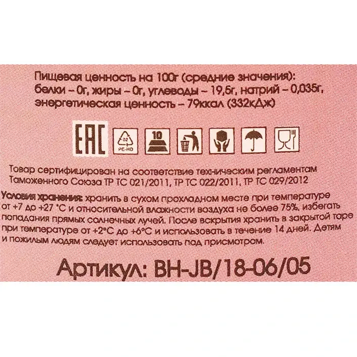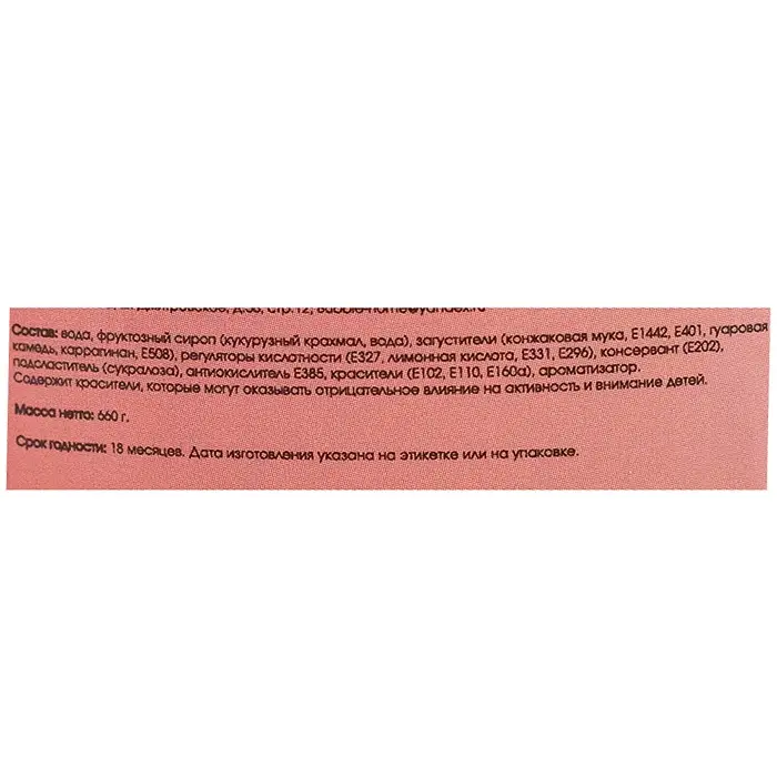 вода), загустители (конжаковая мука, Е1442, Е401, гуаровая камедь, каррагинан, Е508), регуляторы кислотности (Е327, лимонная кислота, Е331, Е296), консервант (Е202), подсластитель (сукралоза), антиокислитель Е385, красители (Е102, Е110, Е160a), ароматизатор