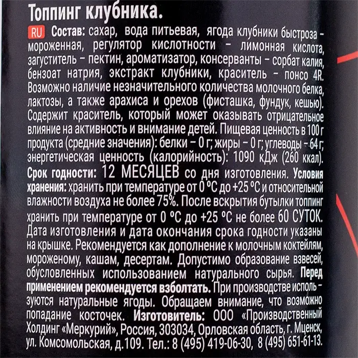 Сахар, вода питьевая, глюкозно-фруктозный сироп, ягоды клубники, загуститель пектин, регулятор кислотности — лимонная кислота, ароматизатор натуральный или идентичный натуральному «Клубника», консервант сорбат калия.