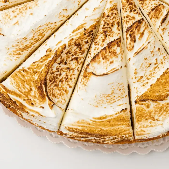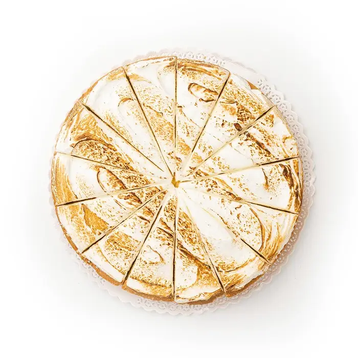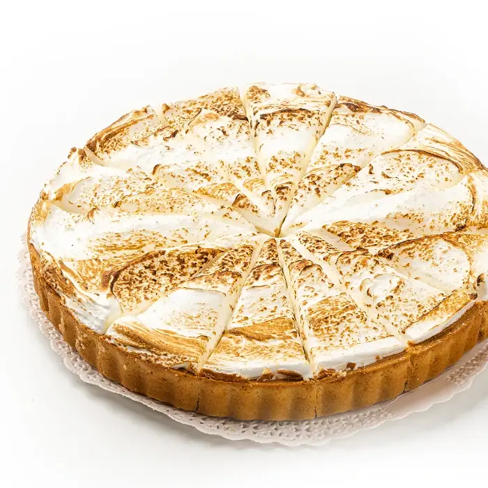 Основание торта выполнено из воздушного и хрустящего песочного теста. Начинка торта — нежный и насыщенный лимонный крем, гармонично сочетающий в себе сладкие и кислые ноты. На вершине торта расположена легкая, воздушная меренга, взбитая до устойчивых пиков и обжаренная до золотистого цвета. Она добавляет десерту особую нежность и сладость.