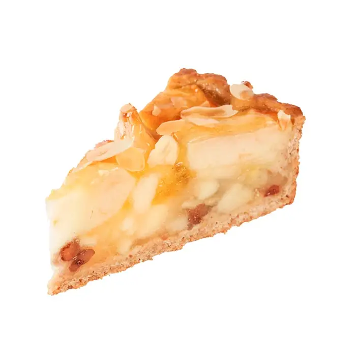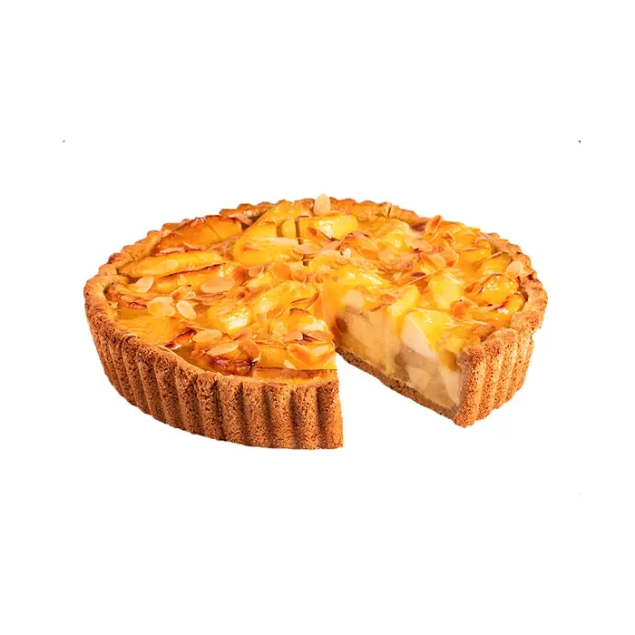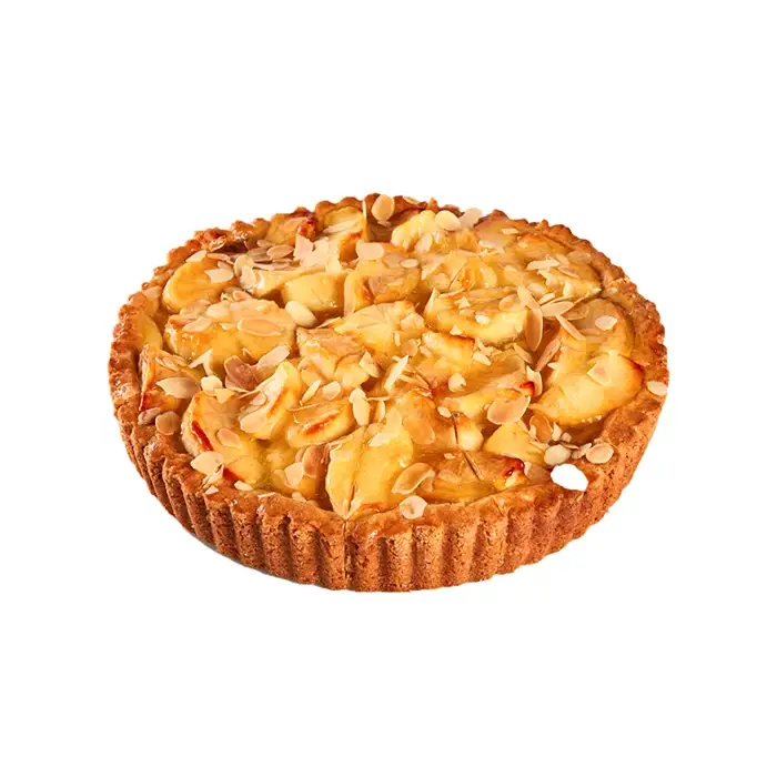 Яблоко замороженное дольки, мука пшеничная в/с, глазурь нейтральная для покрытия (сироп клюкозный, вода питьевая, сахар, загуститель пектин, ксантановая камедь, регуляторы кислотности: кислота лимонная, цитрат калия, консервант сорбат калия, уплотнитель - хлорид кальция), вода питьевая очищенная, маргарин (рафинированные дезодорированные растительные масла: пальмовое, модифицированное пальмовое, модифицированное пальмоядерное, модифицрованное масло ши, вода, эмульгаторы Е472с, Е475, Е433, консерванты Е200, Е211, краситель Е160в, ароматизатор, регулятор кислотности Е330), яблоко замороженное кубик, сахар, меланж яичный пастеризованный, сок яблочный концентрированный, смесь сухая ((соевая мука, пшеничный крахмал, разрыхлитель Е500ii, сухая молочная сыворотка, разрыхлитель Е450i, декстроза (пшеница, кукуруза), соль, ароматизатор "ванилин", ароматизатор "масло сливочное")), комплексная пищевая добавка (загустители Е1414, Е1422, сахар), миндаль слайсы, загустители: ксантановая камедь, гуаровая камедь, желток: яичный пастеризованный, корица молотая, ароматизатор, загуститель камедь рожкового дерева, краситель бета-каротин.