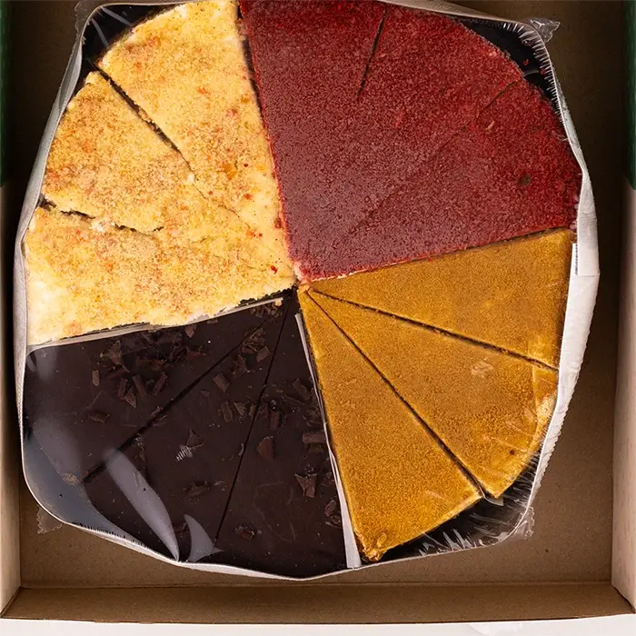 Ассорти тортов из 4 вкусов: «Прага», «Медовик», «Красный бархат», «Морковный». Прага — классический бисквитный шоколадный торт темно-коричневого цвета, посыпанный шоколадной крошкой. Медовик состоит из воздушных медовых коржей и сливочно-сметанного крема. Красный бархат — шоколадные коржи, пропитанные кремом из сливочного сыра. Морковный — торт с морковным бисквитом, нежным кремом, цукатами из сочных апельсинов и пряной корицы.